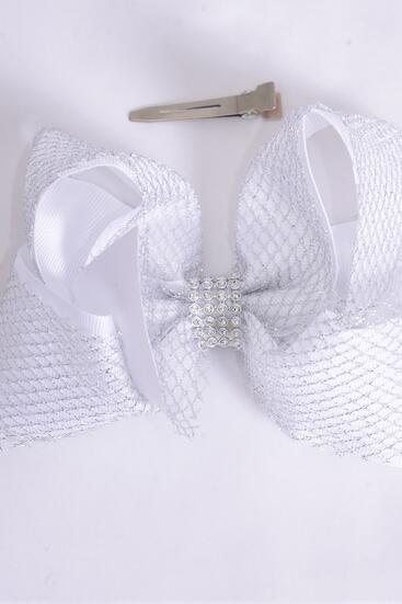 Hair Bow Jumbo Double Layered Silver Mesh Grosgrain Bow-tie White / 12 pcs...