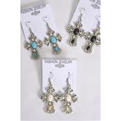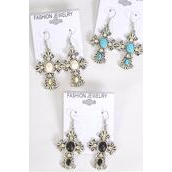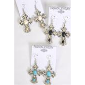 Earrings Metal Antique Cross Semiprecious Stone / 12 pair = Dozen match 27129 75025