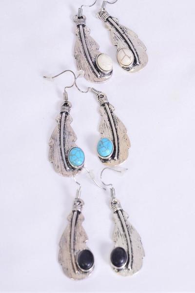 Earrings Metal Antique Feather Symbol Semiprecious Stone / 12 pair Flower = Dozen
