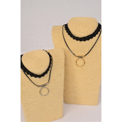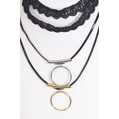 Necklace Choker 2 Strand Black Lace & Circle Pendant / 12 pcs = Dozen