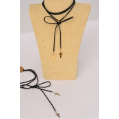 Necklace Choker Faux Cord String Wrap Bolo Tie Cross Metal Accent On Bottom / 12 pcs = Dozen