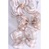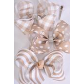 Khaki , Alligator Clip , Bow - 6" x 5" Wide , 4 of each Pattern Asst , Clip Strip & UPC Code