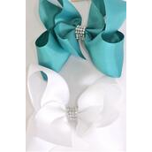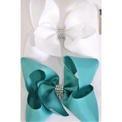 Hair Bow Jumbo Center Clear Stone Jade Green White Mix Grosgrain Bowtie / 12 pcs Bow = Dozen