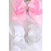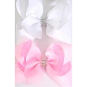 Hair Bow Jumbo Center Clear Stones Baby Pink White Mix Grosgrain Bow-tie / 12 pcs Bow = Dozen