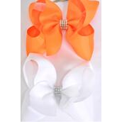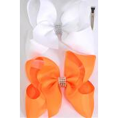 Hair Bow Jumbo Center Clear Stones Orange White Color Mix Grosgrain Bow-tie / 12 pcs Bow = Dozen